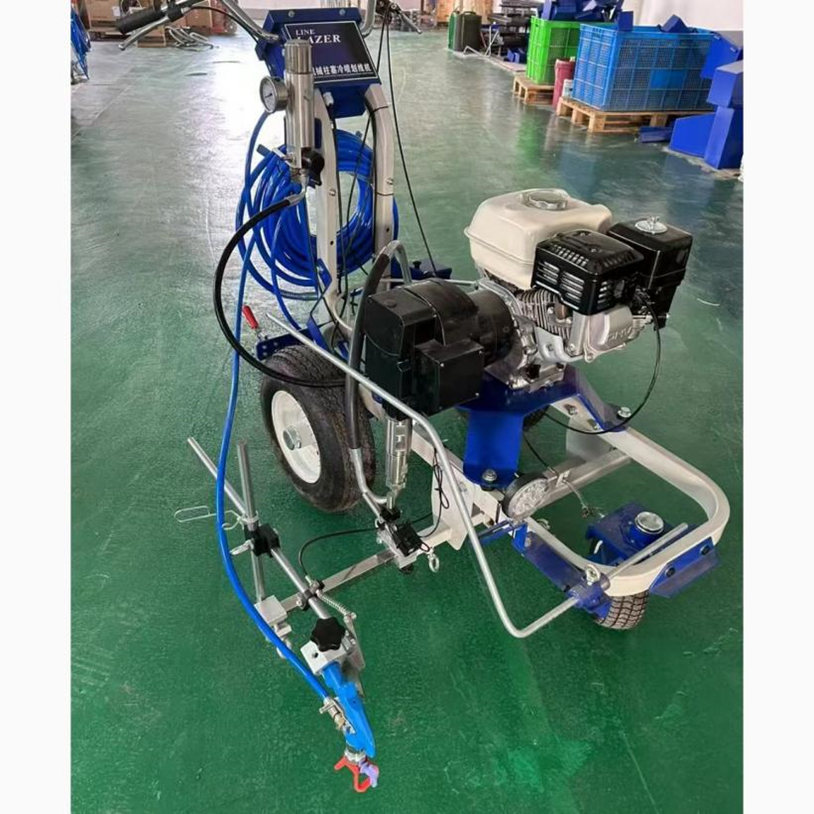 Cold Paint Road Marking Machine is a special equipment for pavement marking that does not require heating paint and relies on an engine to drive a high-pressure plunger pump to form high-pressure airless spraying. Powered by gasoline, diesel or electricity, it pressurizes normal-temperature paints (water-based, oil-based, acrylic, etc.) and sprays them directly onto the road surface through a spray gun. It can quickly mark various traffic lines such as solid lines, dashed lines, zebra crossings, arrows and characters, and is widely used in roads, parking lots, airports, factories, residential areas and other scenarios.